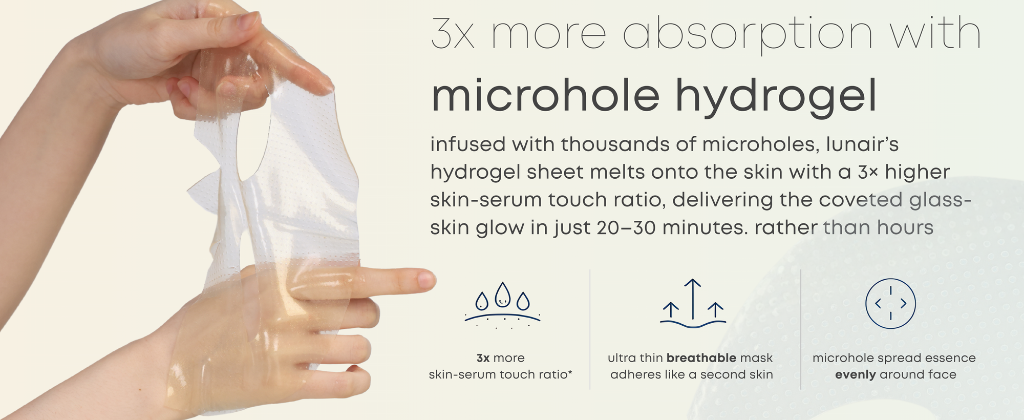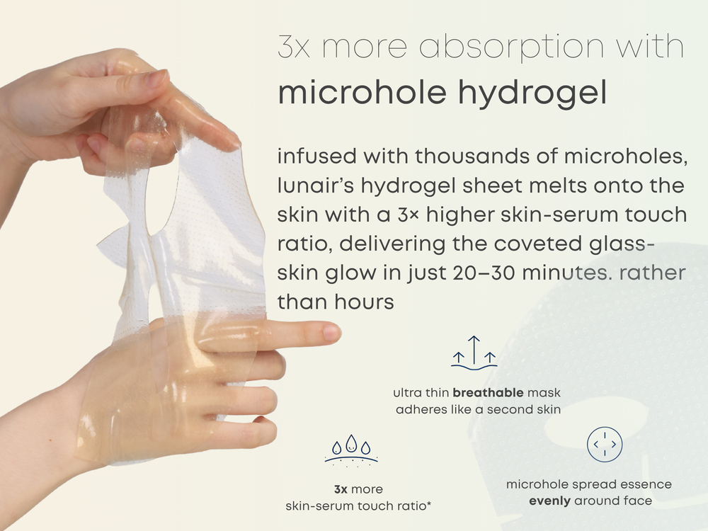 Unlike cotton sheet masks, hydrogel masks hold more essence and cling better to the skin. Lunair’s microhole hydrogel technology releases ingredients slowly based on your skin’s temperature for longer hydration and deeper absorption.